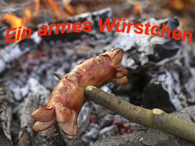 Und dann wirst du ganz Mann und springst in den Wald – nicht mit dem Spaten, sondern mit deinem Bikermesser. Und mit kundigen Griffen, die dir in uralten Zeiten in die Gene gelegt worden sind, hast du deine Beute schnell im sehnigen Griff, und schon kehrst du beschwingt zurück mit deiner Beute zu Zelt, Bike und Braut . Links unter dem Arm eine Ladung trockener Äste und rechts einen Satz frischer Zweige.