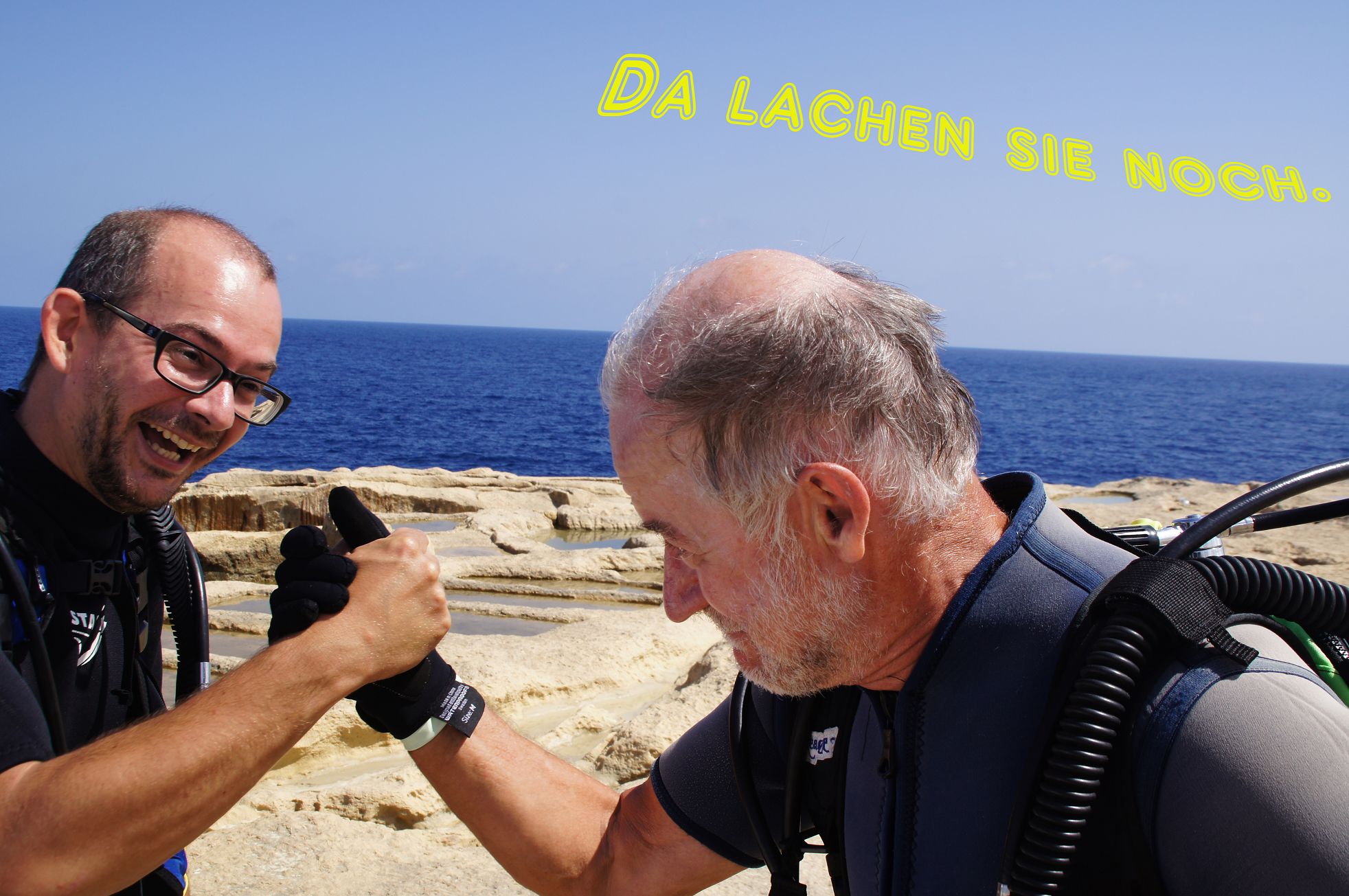 Als letzter treibt Klaus in der Brandung. Und das kann ich sehen, von oben, Panoramablick. Er landet an, ein mächtiger Brecher reißt ihn zurück, die brodelnde See lässt ihn kreiseln, überspült seine Tarierweste – ich könnte der See in die Weichteile treten – dann hebt ihn eine freundliche Welle, zwar nicht in des Vaters Arme, so doch auf den Felsen, wo er wie eine aquatische Sonderausführung hin- und her gedreht wird, bis ihn unsere Briten fest im Griff haben.