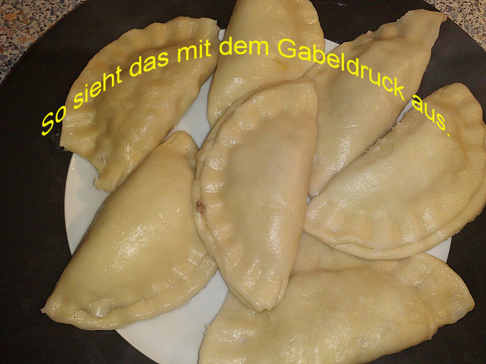 Teigkreise ausstechen. Etwa einen Teelöffel von der Füllung auf jeden Teigkreis geben, den Teigkreis umschlagen und zu einer halbmondförmigen Teigtasche formen, wobei die Ränder fest zugedrückt werden. Dazu kannst du auch eine Gabel nehmen. Das gibt dann ein sehr schönes Muster. Pedanten bestreichen den Rand gerne mit Eiweiß, damit die Klebung bombenfest wird. Ich bin risikobereit und schenke mir dass.